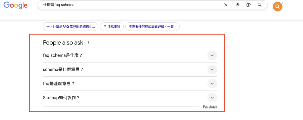 當你完成 FAQ Page Schema 你的 FAQ 內容有機會直接出現在搜尋結果的「Rich Results」(加強版搜尋結果),而不只是普通的一串藍色文字連結。
