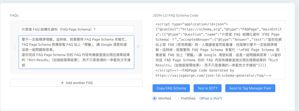 市面上已經有一些工具能幫忙快速生成 FAQ Schema,舉例來說: