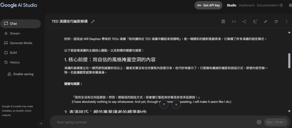 - 輸入 prompt:「請幫我整理這段演講的五個核心觀點,搭配關鍵句摘要」,AI Studio 輕鬆完成筆記,省下時間。