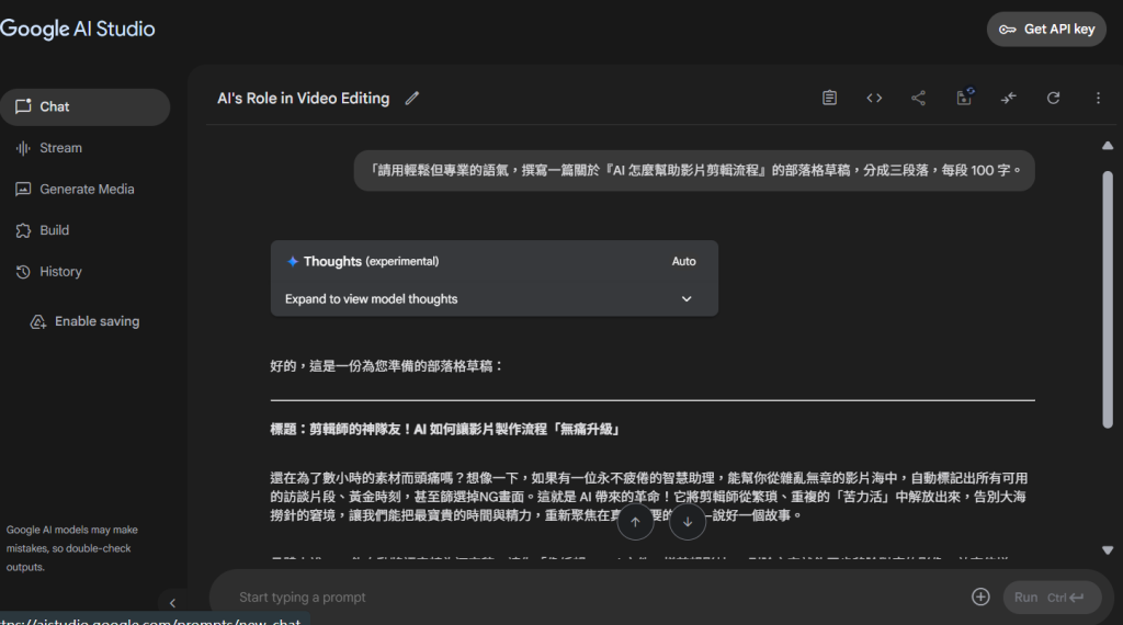 如果你有明確的工作需求,例如寫稿、摘要、會議紀錄轉文字,AI Studio 能帶來的效率提升非常明顯。相信你善用這個工具,可以大幅提升你的效率,獲得更高效的產出!