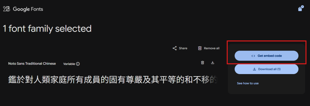 Step 3:複製 Google Fonts 提供的嵌入碼,貼進你的 HTML 頁面中的<head>區塊