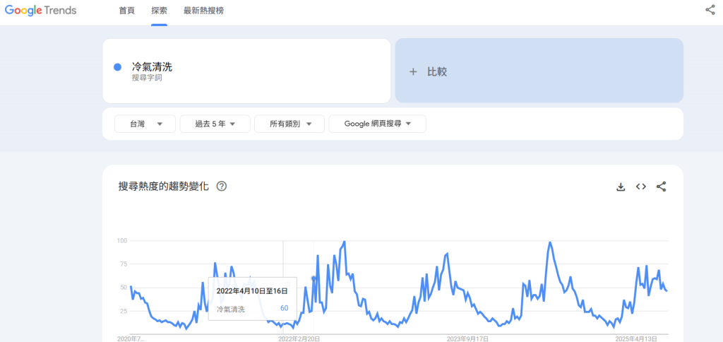 有一季我們協助一間生活用品品牌做 SEO 頁面企劃時,發現「冷氣清洗」這個關鍵字在四月就會有第一次高峰(沒錯,不是夏天,而是春天大家開始準備換季)。