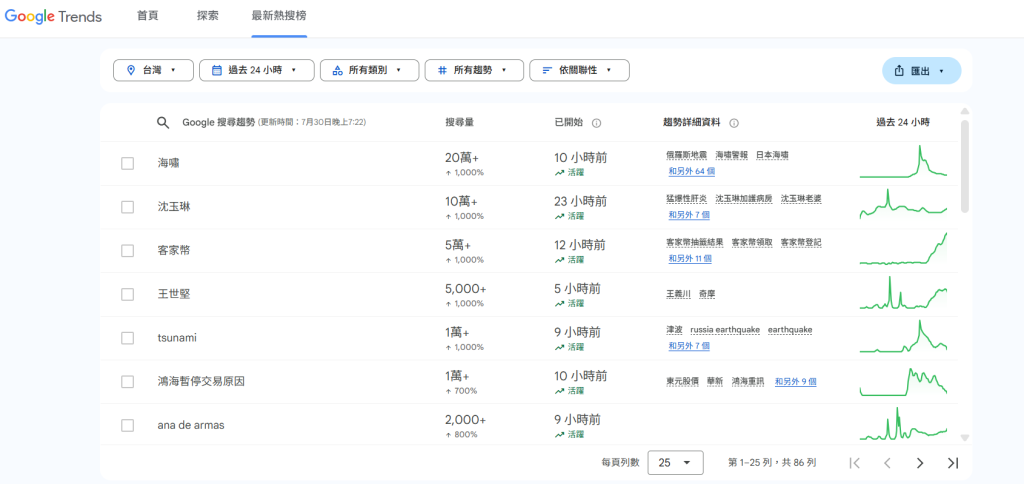 如果你是媒體、行銷、甚至是公關公司的一員,Google Trends 可以當作「議題雷達」。你可以透過每日熱門搜尋排行(Trending Now)快速掌握當下熱搜事件,看有哪些社會事件正在發酵。