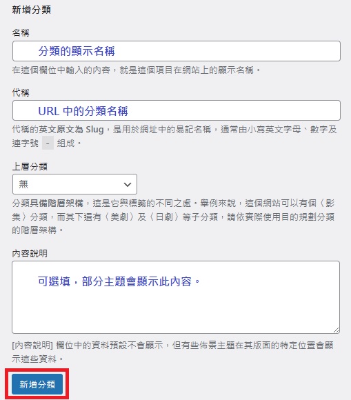 - 代稱:URL 中的分類名稱,建議使用英文小寫並以連字符分隔。