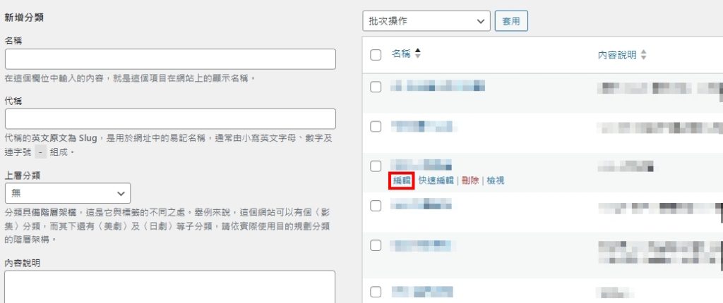 - 在「分類」列表中,找到欲編輯的分類,點選其下方的「編輯」。