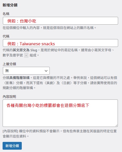 範例:在「文章」底下的「分類」裡,填寫好「名稱」、「代稱」,就可以直接 新增分類,「上層分類」跟「內容說明」可視需求填寫。底下以台灣小吃為例,新增分類所填寫的範例。
