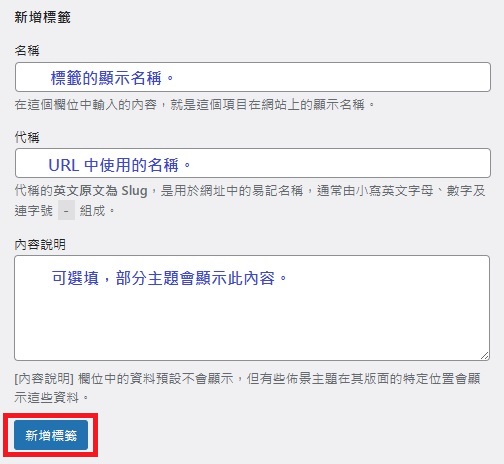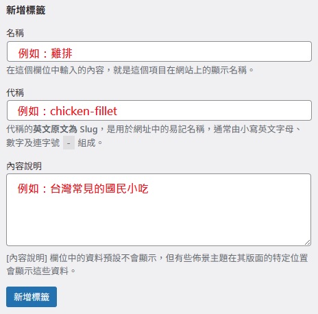 範例:在「文章」底下的「標籤」裡,填寫好「名稱」、「代稱」,就可以直接 新增標籤。底下以台灣小吃為例,新增標籤時所填寫的範例。