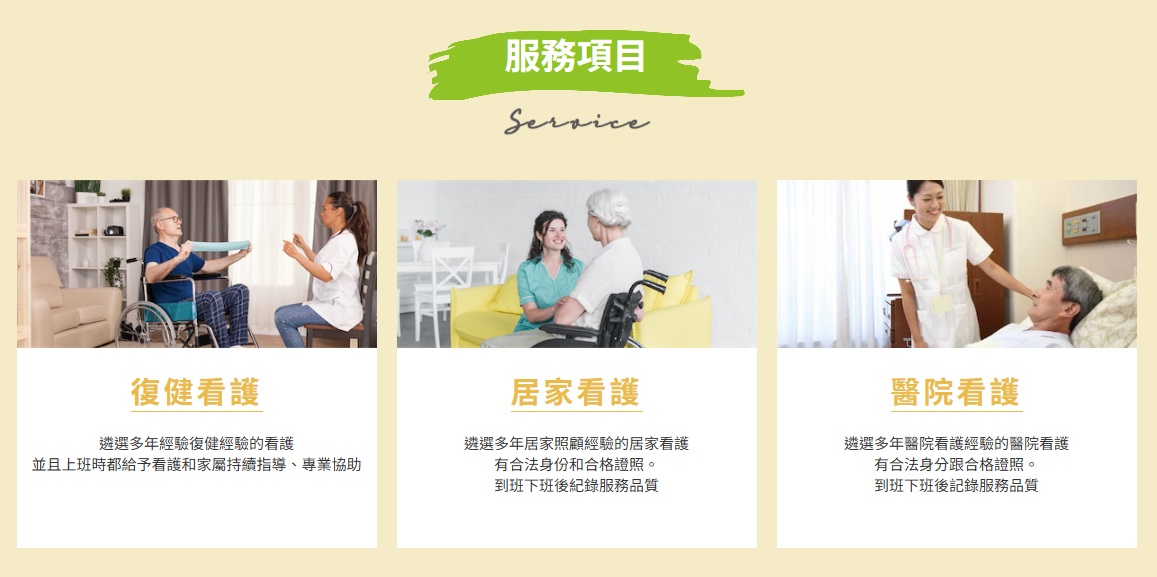 首頁清楚呈現服務項目,能讓訪客在第一時間理解品牌提供的內容,迅速找到符合需求的服務。每個服務項目對應的標題與描述,都能自然融入關鍵字(如「復健看護」、「居家看護」、「醫院看護」),有助於搜尋引擎理解網站架構,提升在相關關鍵字的自然排名。