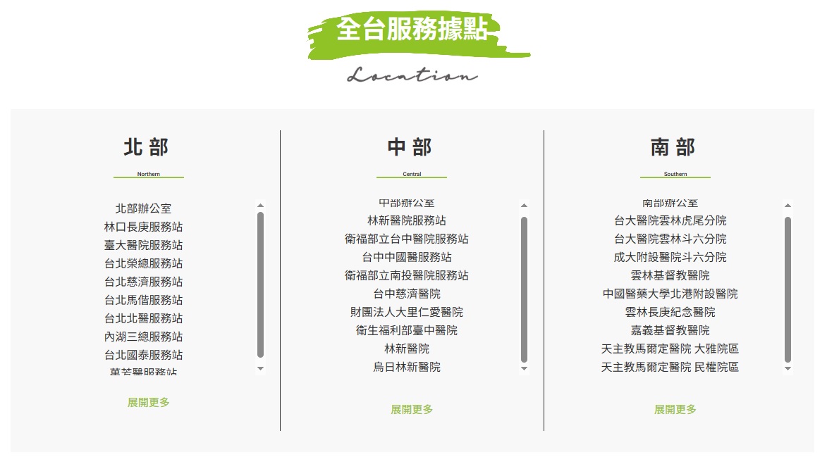 對於急需醫療看護服務的家屬與患者而言,快速找到就近的據點資訊至關重要。據點資訊越明確,越能減少顧客在網站上的搜尋時間,提升使用體驗,也讓品牌顯得規模完整、值得信賴。